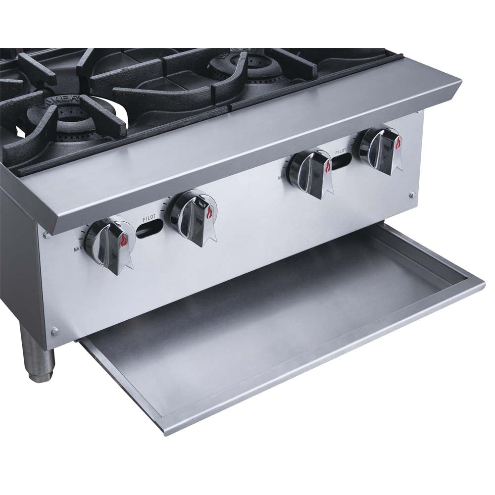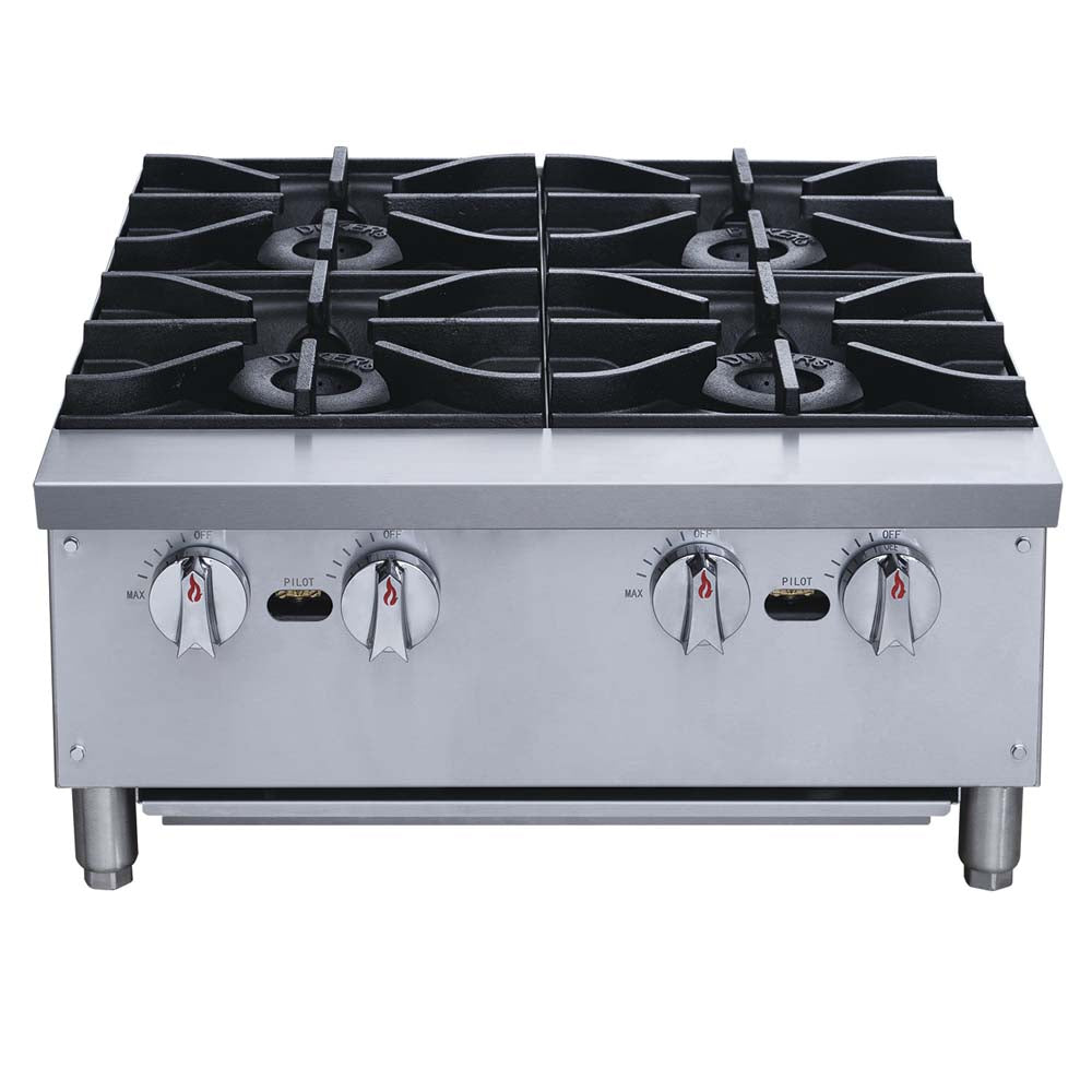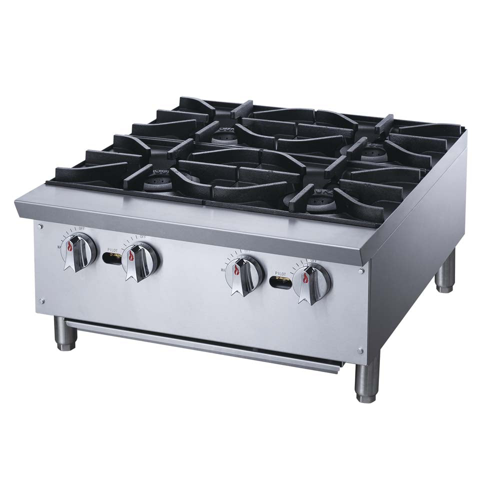 - Incluye 2 parrillas superiores de fundición de fierro, 4 quemadores circulares de 28,000 btu c/u (Total 112,000 BTU/H), con válvulas de control de flama, pilotos individuales por quemador, perillas de control metálicas, charola de desperdicios desmontable, 4 patas robustas con niveladores, conexión posterior de 3⁄4” de diámetro.